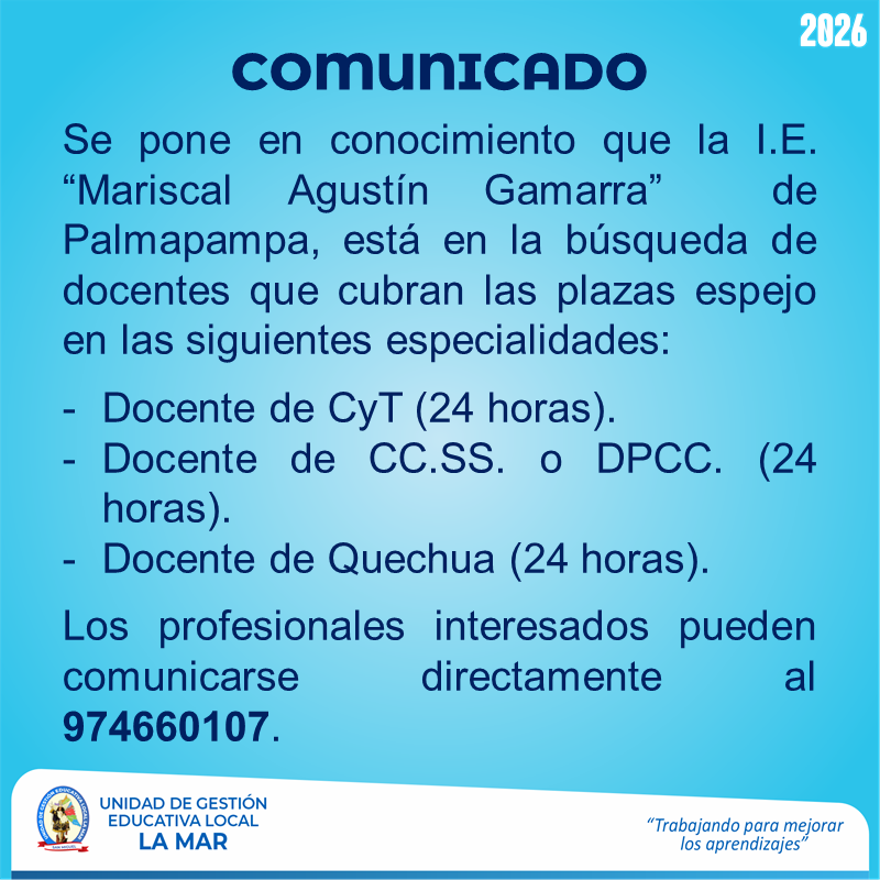 Plaza vacante por renuncia en la Institución Educativa “Andrés Avelino Cáceres” Isoqasa - Anchihuay, en el área de Educación para el Trabajo (24 horas), adjudicación según ranking de la Tercera Etapa, este lunes 16 de marzo de 2026, a las 8:00 a.m.