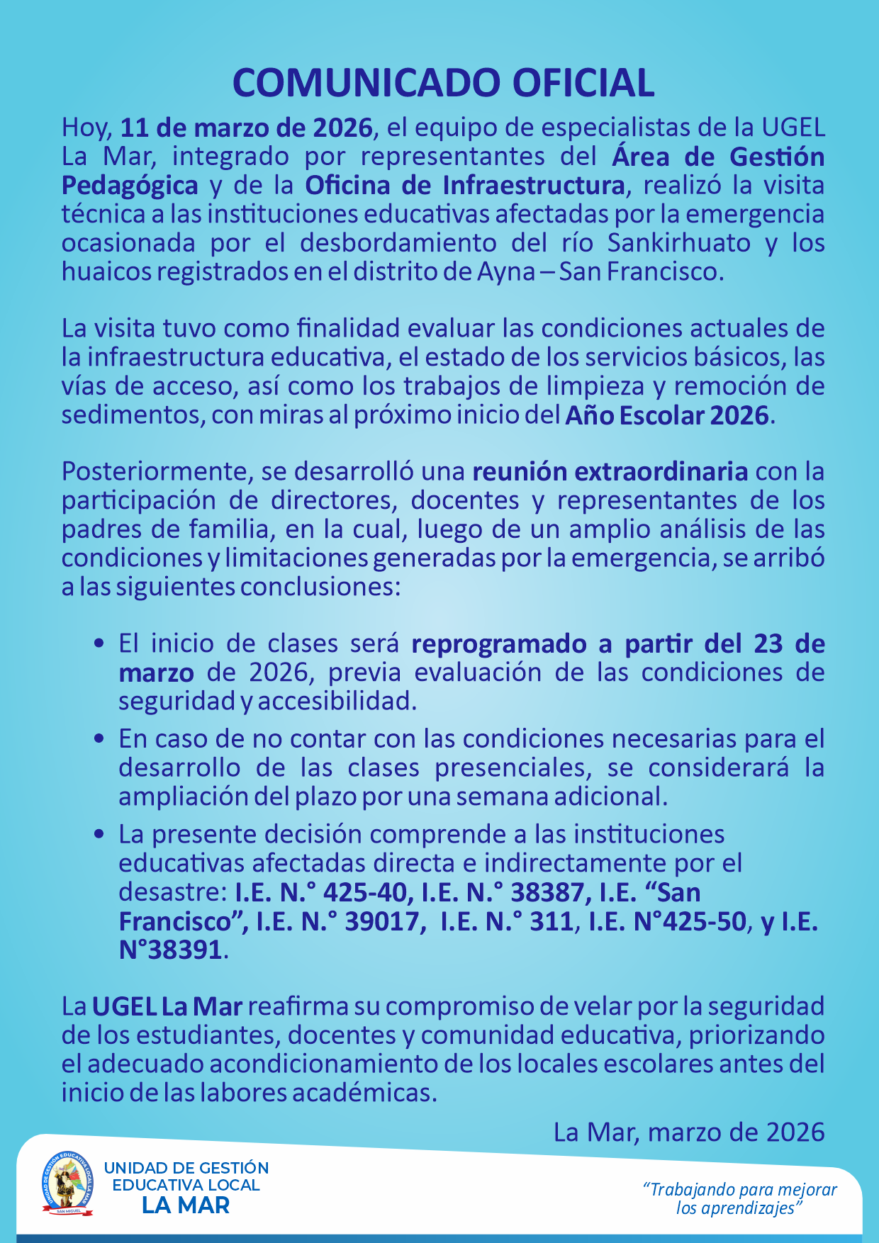 🔵 Frente a la emergencia registrada en Ayna – San Francisco, desde la UGEL La Mar informamos que venimos realizando monitoreo permanente en las instituciones educativas, en coordinación con directores y autoridades locales.