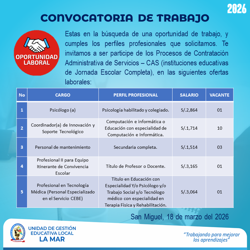 A todos los postulantes del proceso de contrato docente 2026, que se ha generado plazas vacantes en el nivel inicial, primaria y secundaria, por consiguiente, se llevará a cabo la adjudicación el día viernes 13 de marzo de 2026, a horas 9 am, en el auditorio a de la UGEL La Mar.