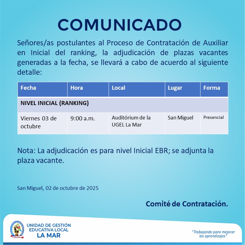 Escrito en 17 Septiembre 2025. Visto: 77 CRONOGRAMA PARA LA CONTRATACIÓN DOCENTE 2025 ETAPA EXCEPCIONAL CONTRATO DOCENTE EBR: CIENCIAS SOCIALES (POR EVALUACIÓN DE EXPEDIENTES) VER CRONOGRAMA AQUÍ VER PLAZA AQUÍ
