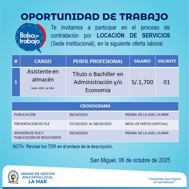 Escrito en 06 Octubre 2025. Visto: 52 Convoca al III Taller de Fortalecimiento de Capacidades Pedagógicas dirigido a directivos del nivel secundaria del ámbito de la UGEL La Mar. Oficio Múltiple N° 232-2025-UGEL-LM VER ANEXO AQUÍ
