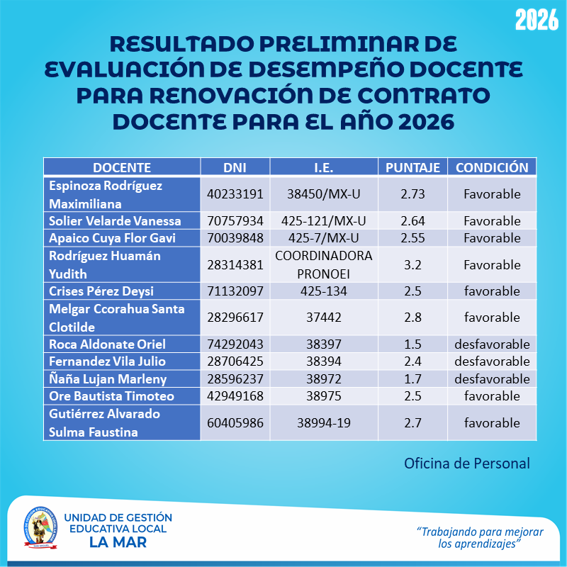 Escrito en 20 Enero 2026. Visto: 10 👉Atención: Resultado Preliminar de Evaluación de Desempeño Docente para Renovación de Contrato Docentes para el año 2026