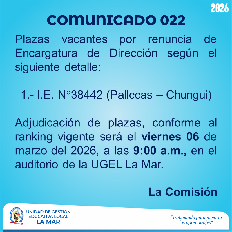 Escrito en 05 Marzo 2026. Visto: 11 Convoca a la I Asistencia Técnica a Promotores Educativos Comunitarios de PRONOEI de la UGEL La Mar. Ver Oficio Múltiple N° 033-2026-UGEL-LM: