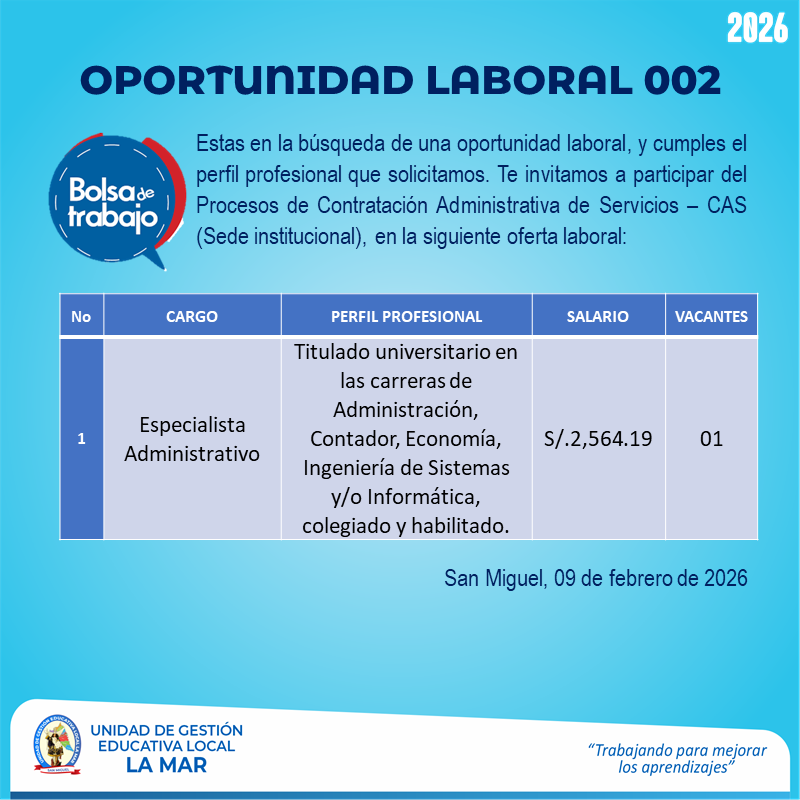 #OportunidadLaboral #CAS2026 #UGELLaMar #BolsaDeTrabajo #ConvocatoriaCAS 💼🚀