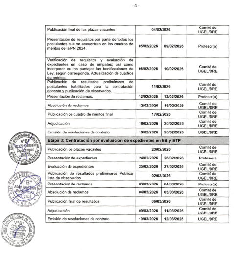 Escrito en 30 Enero 2026. Visto: 100 Modificación del cronograma para implementar el procedimiento de contratación docente 2026 Ver Resolución Directoral Regional Sectorial N°102-2026-GRA/GOB-GG-GRDS-DREA-RD: Ver Oficio Múltiple N°030-2026-MINEDU: Siguiente >