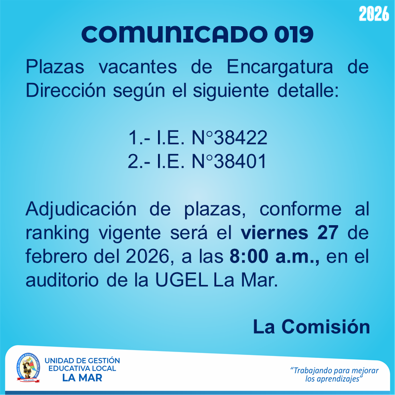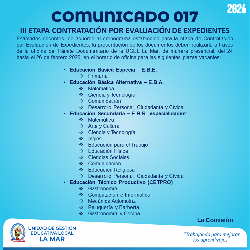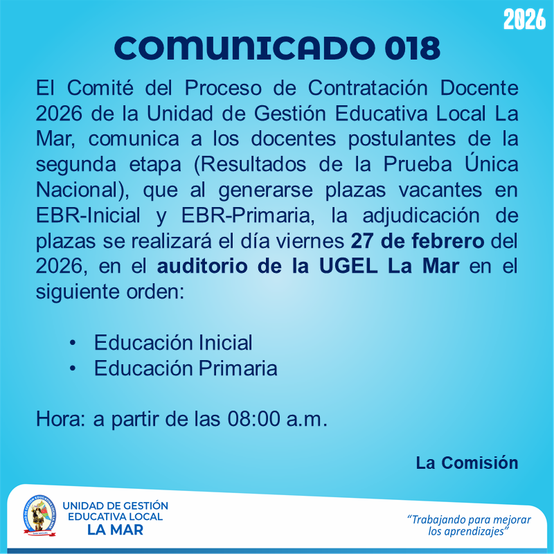 Escrito en 24 Febrero 2026. Visto: 7 Atención: FE DE ERRATAS - PROCESO DE CONTRATO DOCENTE (2DA ETAPA: RESULTADOS DE LA PRUEBA NACIONAL) Ver detalles: