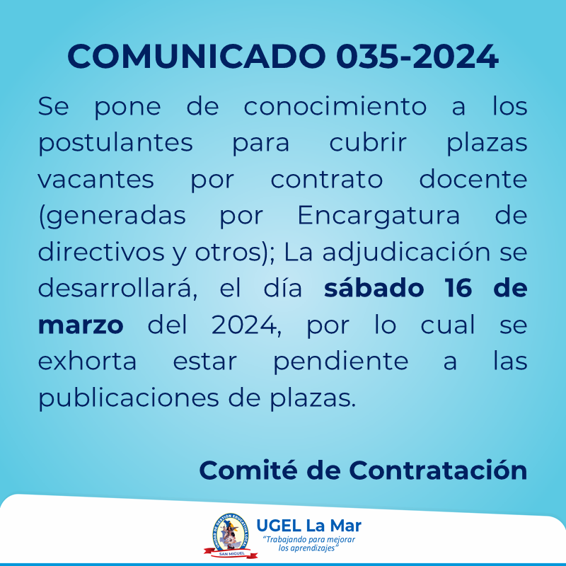 Nota: La adjudicación se llevará a cabo, este miércoles 20/03/2024 a las 11:00 a.m. de la mañana, en los niveles de inicial, primaria, secundaria, E.B.A. y E.B.E., de acuerdo al PN y Evaluación de Expedientes.