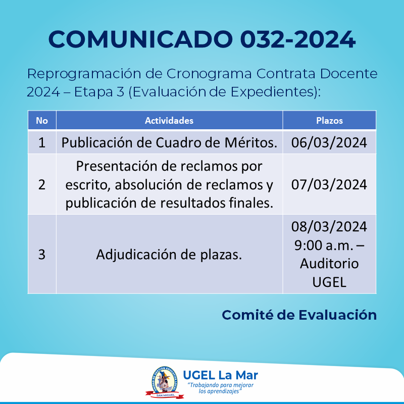 Se adjudicará plazas generadas por Encargaturas de cargos Directivos y otros en el nivel inicial, primaria y E.B.A., el 16 de marzo del 2024, a las 08:30 a.m., en el auditorio de la UGEL La Mar.