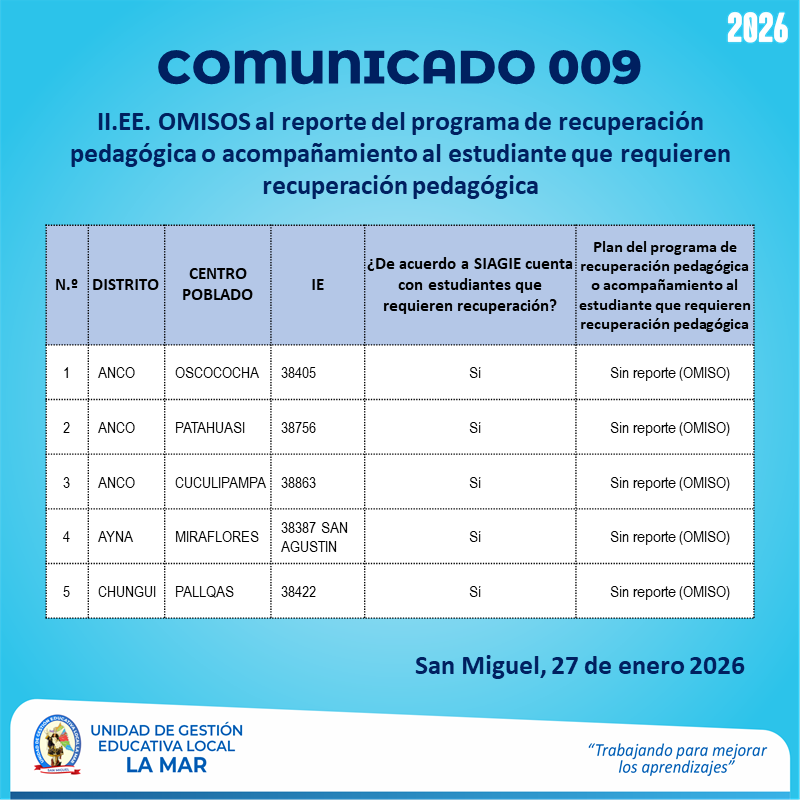 Escrito en 22 Enero 2026. Visto: 83 Omisos al reporte del estado de la infraestructura de las condiciones del PNAE Ver detalles:
