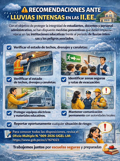 Escrito en 28 Enero 2026. Visto: 49 Recomendaciones a implementar en las instituciones educativas durante el periodo de lluvias intensas y peligros asociados. Ver Oficio Múltiple N° 009-2026-UGEL-LM: